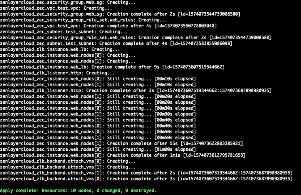 Apply complete! Resources: 10 added, 0 changed, 0 destroyed